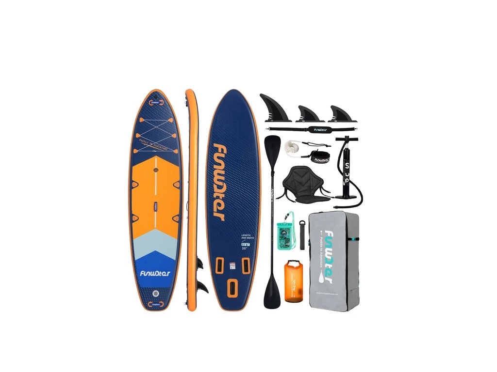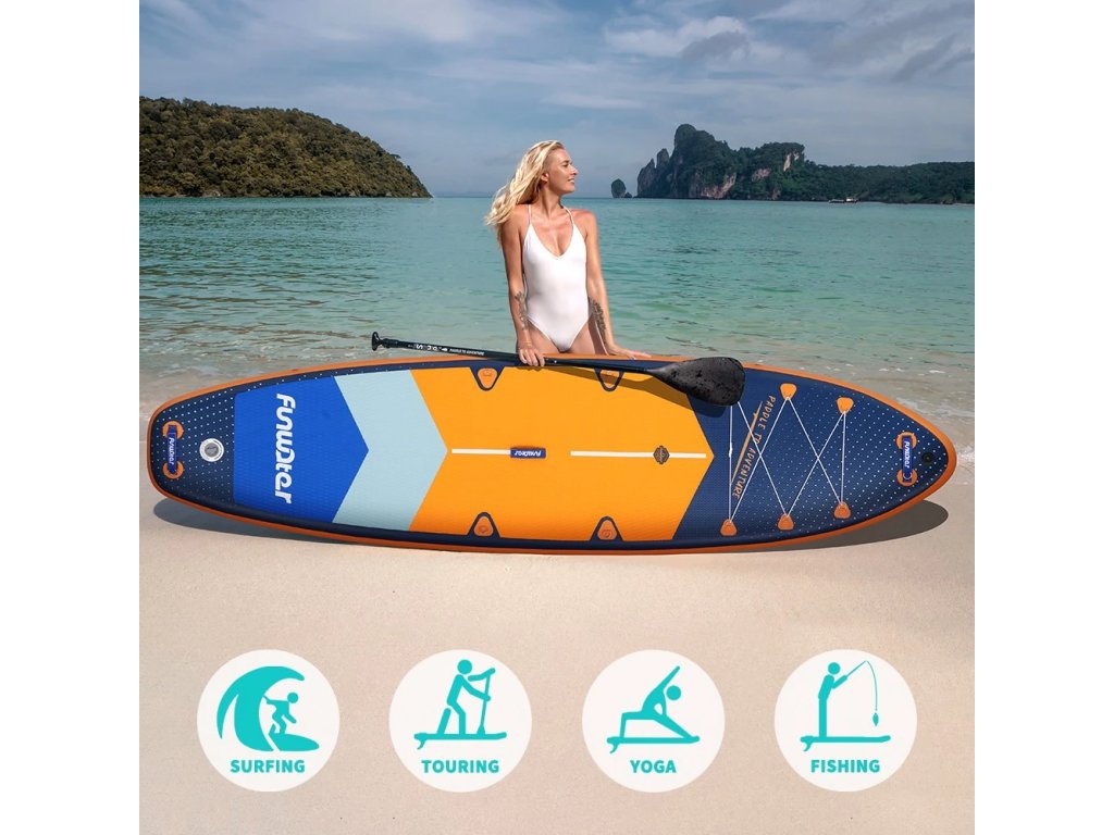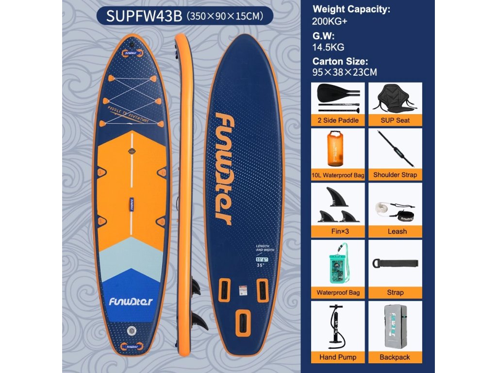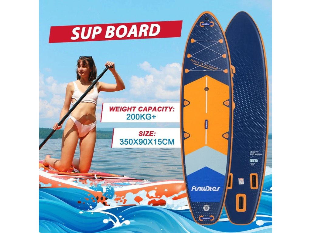 FunWater BlueLake 350×90x15 cm – placă de paddleboard stabilă cu o capacitate de încărcare de 200 kg și accesorii complete. Potrivită pentru începători și familii.