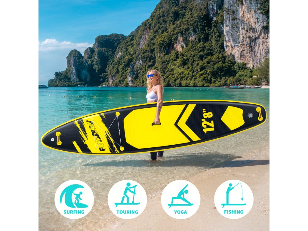 Placa gonflabilă FunWater YellowBase cu dimensiunile de 385×85×15 cm oferă stabilitate ridicată, o capacitate de încărcare de până la 230 kg și o construcție durabilă din PVC. Ideală pentru plimbări pe lac și mare - ușoară, depozitabilă și gata de aventură.